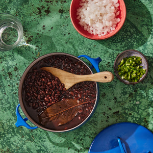 Estos frijoles, bellamente brillantes y de sabor vibrante, son tan versátiles que nos gusta hacer una olla grande al principio de la semana para múltiples tratamientos. Junto a los tacos, acompañando a los huevos fritos o revueltos, mezclados en tazones de granos y, cuando lo que queda es mayormente caldo, batidos en un puré suelto para cubrir molotes o rellenar tetelas.