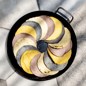 Hemos diseñado nuestro Comal para satisfacer todos sus deseos de hacer tortillas. Sin duda, no se puede hacer eso sin un poco de masa harina a mano, ¿verdad? Este kit combina nuestro Comal Sazonado Made In x Masienda con dos bolsas de nuestra Masa Harina Maíz Nativo , tanto blanca como azul.