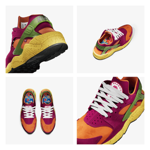 A treat for your feet that’s good enough to eat. The Nike x Masienda Air Huarache PRM "Masa" is a meta moment: a shoe named after a street food that’s named after a shoe. This special edition is a fresh take on legendary designer Tinker Hatfield’s 1991 classic, featuring a thick masa-yellow midsole to act as a foundation for a tapestry of colors and textures, each recalling iconic ingredients of the beloved dish. Earth-toned frijoles and carne asada uppers give way to avocado green and habanero orange accents, while crema-white laces and a radish-inspired tongue patch make for the perfect garnishes. Underfoot, a deep obsidian outsole — the comal, if you will — yields reliable grip, and insoles featuring an iconic hibiscus oilcloth motif bring it all home.