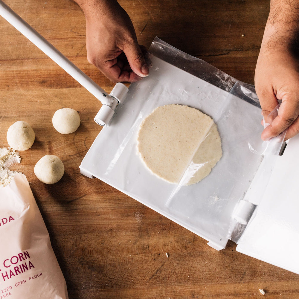Ever since we started selling our award-winning Tortilla Press, people have been asking about the best way to line it. The liner is much more than an incidental detail — it’s a fundamental piece of the tortilla-making process that ensures your masa won’t stick to the press’s surface and that your tortillas transfer seamlessly from press to hand to pan. Our custom press liners are printed with a tortilla ruler (in FDA-approved food-safe ink) and meant to be used and reused to your heart’s content.
